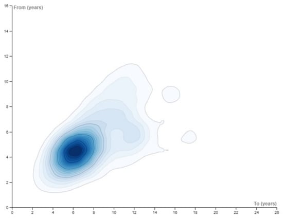 As can be seen in Figure 4, we found the highest density of studies corresponded to age ranges from 5 years to around 6 years.
