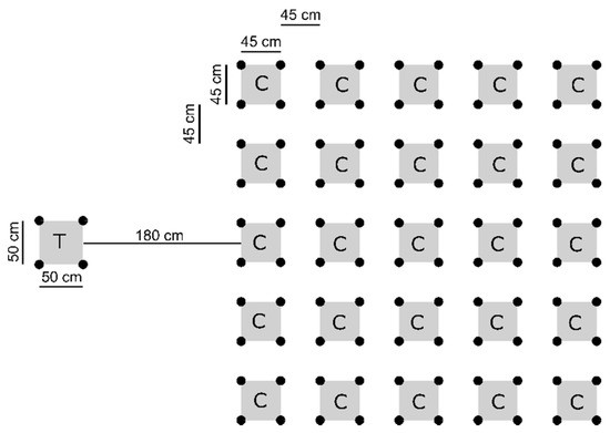 Disposition of squares for the Quadrato Motor Training (QMT) group training. The square reserved to the teacher is indicated with “T”, while the squares reserved to children are indicated with “C”.