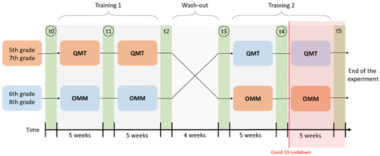 This study adopted a crossover, repeated measures longitudinal design in which children received the two types of meditative training sequentially. During the first 10 weeks, the 5th and 7th grade classes performed the QMT, while the 6th and 8th classes performed the OMM. Allocation of classes to one training or another did not follow any specific rule, except that two consecutive classes could not do the same training in the same phase to balance training with developmental stage. Then, the classes switched their respective trainings and started the second 10-weeks training phase. A 4-week washout period corresponding to the length of the winter holiday break separated the two training phases. A washout is targeted to be long enough to rule out the effects of the first training phase [70]; however, to the best of our knowledge, there is currently no consensus on how long a washout period should last to erase any cognitive improvements from meditation-based trainings. Thus, aiming to maximize feasibility, we chose a washout period synchronized with the ecological school schedule context.