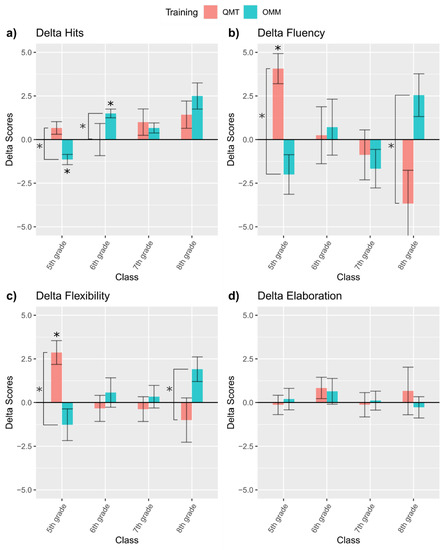 Delta scores for (a) Hits in Hidden Figure Test (HFT); (b) Fluency in Alternative Uses Test (AUT); (c) Flexibility in AUT; (d) Elaboration in AUT. Significance levels reported above bars mean that the score is significantly different from 0 with Bonferroni corrected alpha: * = p < 0.006; significance levels reported on the side of bars mean that ANOVA revealed significantly different scores between trainings: * p < 0.05.