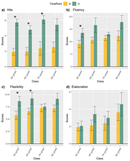 The amount of hits at the second baseline were significantly higher than the hits at the first baseline for the 5th, 6th, and 7th graders (all p-values < 0.0125), while for the 8th graders, this difference did not reach the adjusted α level (p = 0.035) (Figure 4a). Cohen’s d revealed a large effect size for all classes (5th grade d = 2.22, CI = 0.93–3.51; 6th grade d = 1.49, CI = 0.29–2.56; 7th grade d = 1.89, CI = 0.27–3.38; 8th grade d = 1.36, CI = −0.08–2.81). In general, we observed that, in the assessment immediately after the washout (t3), children’s performance was better than in the first baseline assessment (t0).