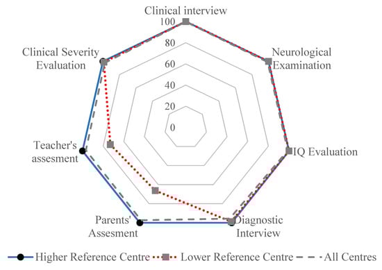 A retrospective study based on medical records was conducted. Data were identified from the Regional ADHD Registry. Formal ethical review board approval was not required for the present updating because it was previously approved by the Institutional Review Board of the Istituto di Ricerche Farmacologiche Mario Negri IRCCS, Milan, Italy. Written informed consent was obtained from all patients before data collection. We used the previously described methodology and reported data concerning the local health setting [7], the characteristics of the ADHD Registry activated in Lombardy in June 2011 [20,21], the systematic work carried out by the 18 ADHD centres [19], and the diagnostic assessment and the treatment conducted by all involved clinicians, according to the national and international guidelines [8,9]. Behavioural and emotional problems were highlighted with the most used and validated rating scales for parents and teachers, Conners’ Parent Rating Scale (CPRS) [22], Conners’ Teacher Rating Scale (CTRS) [23], and the Child Behaviour Checklist (CBCL) [24], while symptom severity and symptom improvement were quantified, respectively, with the use of the Clinical Global Impression—Severity scale and the Clinical Global Impressions—Improvement scale [25]. Results from the scales were analysed and compared with the perceptions of parents and teachers, as well as the perceptions of mothers and fathers. The Clinical Global Impressions—Improvement Scale scores were analysed after 12–18 months of follow-up. The percentages of completeness of the seven areas of the shared diagnostic assessment (Clinical Interview, Neurological Examination, IQ Evaluation, Diagnostic Interview, Parents and Teachers Assessment, Clinical Severity Evaluation) of all regional centres were analysed and displayed on radar chart axes with a range of 0 to 100%