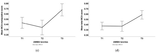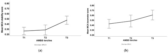 AMBS classification groups regarding MCA values: (a) Mean scores of the AMBS terciles in the stability component. (b) Mean scores of the AMBS terciles in the locomotor component. (c) Mean scores of the AMBS terciles in the manipulative component. (d) Mean scores of the AMBS terciles in Total Motor Competence.