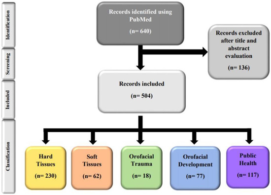 A total of 640 papers were identified by PubMed search. Then, 136 were excluded following the title and abstract screening (Table S2), leaving 504 papers for consideration (Table S3). Figure 1 shows the PRISMA flow diagram of the selection process and the classification process by area of the included papers.
