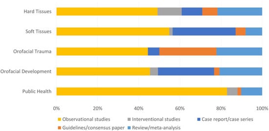 An observational study was the most prevalent type of study in all areas, ranging from 44.5% in the orofacial trauma area to 82.9% in the public health area (Figure 2). Guidelines papers reached the highest value in orofacial trauma (27.7%), whilst case reports were more prevalent in soft tissues area (30.7%) and orofacial development area (27.3%).