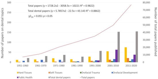 Figure 3 displays the publication trends of papers on dental topics and total papers published in the selected pediatrics journals over the last seven decades (1951–2020). An increasing trend has been observed for both variables (R2 = 0.9822 for total papers and R2 = 0.8862 for total dental papers) with no significant differences (χ2(6) = 0.051 p > 0.05), although the rise in numbers of papers on dental issues has been delayed, starting from the 1990s. Within papers on dental issues, those featuring hard tissues and public health issues mostly contributed to the publication trend in the last three decades (Figure 3).