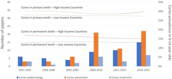 Publication trend on caries topics and caries prevalence in children from high- and low-income countries (data from the Global Health Data Exchange website, 1991–2021).