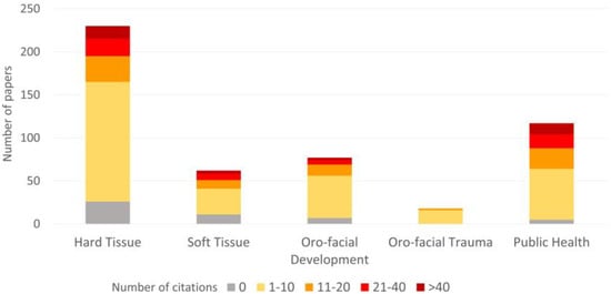 The majority of papers (n = 292, 57.9%) were cited between 1 and 10 times, whilst less than 7% of papers received more than 40 citations. A small group (n = 46, 9.1%) of papers have no citations, and only four papers have obtained more than 100 citations (Table S3). The citations distribution of the included studies is displayed by area and topics in Table 3 and Figure 5. Papers on hard tissues and public health received the highest number of citations (n = 2762, 43.9% and n = 2028, 32.3%, respectively), with caries prevention and health insurance as the most cited topics (17.8% and 14.1% of the total citations, respectively). Papers focusing on oral health as the primary outcome were cited more than those in which it was not, except for soft tissues and orofacial development areas. The highest average number of citations per paper was observed for public health area (mean = 17.3), followed by hard tissues (mean = 12.0), soft tissues (mean = 11.9), orofacial development (mean= 8.8), and orofacial trauma (mean = 4.6) area. All areas, except for orofacial trauma, included papers with a number of citations greater than 40; nevertheless, orofacial trauma did not include any paper with no citation.