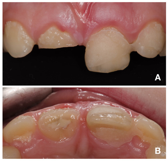Intraoral photographs of teeth 12–22. (A)—buccal view; (B)—occlusal view.