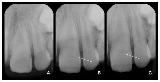 Diagnostic X-rays of teeth 21 and 22 in three different angulations [21]. (A)—foreshortened X-ray (increased angulation of central beam to the direction used in ordinary occlusal exposure). The fracture line is almost not visible. (B)—distortion-free X-ray (angulation used in ordinary occlusal exposures). The fracture line started to be pronounced; see arrow. (C)—elongated X-ray (decreased angulation of central beam to the direction used in ordinary occlusal exposure). The fracture line is clearly visible; see arrow.