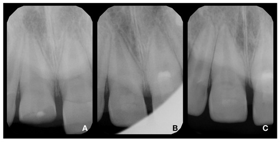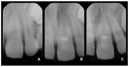 X-rays of tooth 11. (A)—diagnostic X-ray of tooth 11; (B)—postoperative X-ray of tooth 11; (C)—control X-ray at 24-month follow-up. The continuing development of the root and narrowing of the root canal is visible. In addition, the formation of a radiopaque bridge under the calcium silicate cement and the absence of periapical radiolucency are apparent.