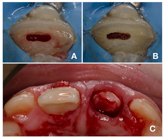 Partial pulpotomy and adhesive fragment reattachment of tooth 11. (A)—clinical situation immediately after pulpotomy; (B)—clinical situation after achieving hemostasis; (C)—occlusal view after adhesive reattachment and removal of coronal fragment of tooth 21.
