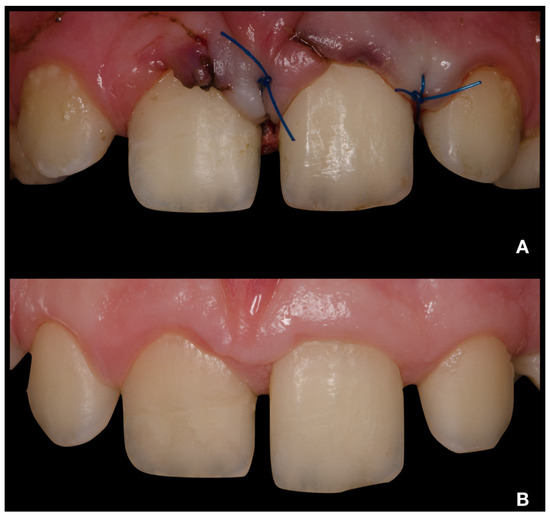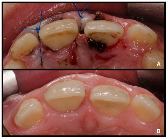 Intraoral photographs of teeth 12–22 from buccal view. (A)—immediately after treatment; (B)—24-month follow-up.