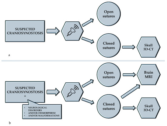 Management of cases of suspected craniosynostosis starting with ultrasonographic examination: (a) suspected craniosynostosis alone; (b) suspected craniosynostosis associated with other conditions. 3D-CT: three-dimensional computed tomography, MRI: Magnetic Resonance Imaging.