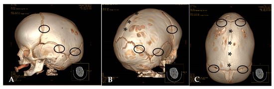 (A–C) CT 3D-Reconstructions (A) Scaphocephaly with patent sutures (ring); (B,C) Patent sutures (ring) and synostotic sagital suture (asterisks).