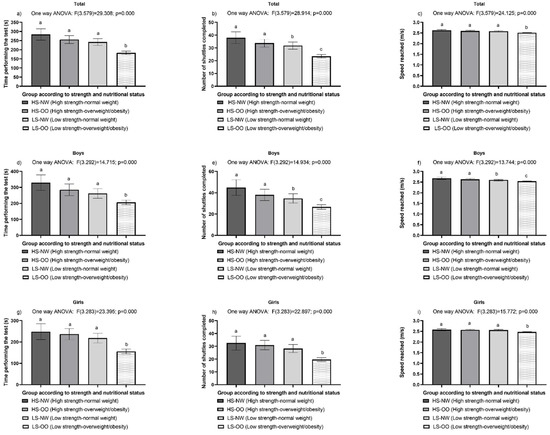 Figure 1 shows the characteristics of the cardiorespiratory capacity of the total sample, according to group and sex. Significant differences between the groups in time, number of shuttles, and speed reached in the 20 m shuttle run test were evidenced in the total sample of schoolchildren ((F(3.592) = 29.308, p = 0.000; F(3.592) = 28.914, p = 0.000; F(3.592) = 24.125, p = 0.000, respectively)). When comparing groups, the low strength-overweight/obese group completed fewer shuttles and reached a lower speed than the rest of the groups. When comparing only the low strength groups, the overweight/obese children completed a fewer number of shuttles compared to the normal weight group (p = 0.000). When segmenting the sample by sex, the same significant differences were observed between the groups in time, the number of shuttles, and the speed reached in the 20 m shuttle run test in boys ((F(3.292) = 14.715, p = 0.000; F(3.292) = 14.934, p = 0.000; F(3.292) = 13.744, p = 0.000, respectively)) and girls ((F(3.283) = 23.395. p = 0.000; F(3.283) = 22.897, p = 0.000; F(3.283) = 11.772, p = 0.000, respectively)). In both boys and girls, again the low strength-overweight/obese group had the lowest performance in time, the number of shuttles completed, and speed reached in the test compared to the rest of the groups. When analyzing and comparing only the groups with low strength, the overweight/obese group also performed a lower number of shuttles (p = 0.000) and reached a lower speed (p = 0.000) than the normal weight group (Figure 1).
