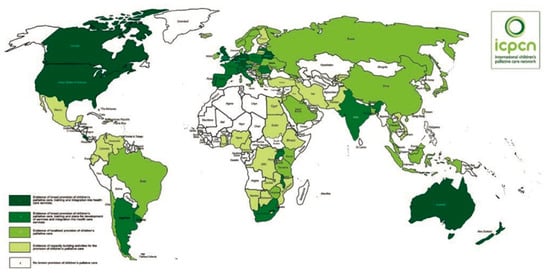 - International Children’s Palliative Care Network (ICPCN). Figure provision of CPC. Available online: https://www.icpcn.org/1949-2/ (accessed on 22 June 2021).