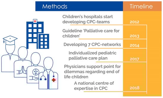 Moreover, with the recognition of CPC, attention has been paid to ethical dilemmas, for which an easily accessible consultation point has been set up for professionals for dilemmas regarding end-of-life questions for children. Furthermore, CPC is embedded and funded by insurance companies. The Knowledge Centre for CPC and the CPC networks are funded by the government. For the CPC teams in the university hospitals, the realisation of sustainable financing is underway. Figure 3 shows the timeline of the results for improving CPC in the Netherlands.