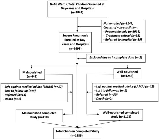 - Ashraf, H.; Alam, N.H.; Sultana, M.; Jahan, S.A.; Begum, N.; Farzana, S.; Chisti, M.J.; Kamal, M.; Shamsuzzaman, A.; Ahmed, T.; et al. Day clinic vs. hospital care of pneumonia and severe malnutrition in children under five: A randomised trial. Trop. Med. Int. Health 2019, 24, 922–931. [Google Scholar] [CrossRef] [PubMed]