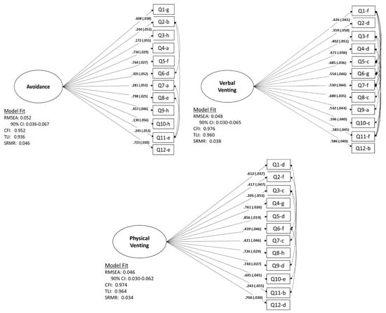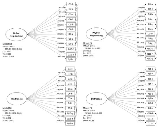 In the initial CFA models, the error terms were not free to correlate. However, model fit indices suggested that fit could be improved for most factors by allowing correlation across items. The correlations across items is, in part, likely capturing methodological similarities (i.e., a similar question format) across constructs. Thus, we then ran each model allowing correlation among error terms. This resulted in excellent model fit for all behavioral strategy factors, with the exception of Self-Soothing (model fit and standardized item loadings for factors are shown in Figure 1 and Figure 2). Thus, the self-soothing factor is not presented. It should be noted that each CFA contains at least one item with lower than desired factor loadings. However, because the format of the questionnaire is such that there is a single question related to each behavioral strategy for each scenario, removing single items from the questionnaire would result in an unbalanced structure. Therefore, because the model fit was still good with these items included, we chose to retain them in the final analyses.