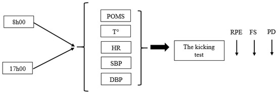 The measurements were taken, in a randomized order, at two different time-of-day: 08:00 h and 17:00 h. For each test session, boys woke up at 06h30 and ate a standardized breakfast. At 12h30, boys ate a standardized iso-caloric lunch. From 12h30 onward, boys were allowed to consume only drinking water. At the beginning of each test session, boys were asked to complete the Profile of Mood States (POMS) questionnaire. In addition, intra-aural temperature (ThermoScan IRT 4520, Braun GmbH, Kronberg, Germany), heart rate (Polar Team System, Polar Electro Oy, Kempele, Finland), and systolic (SBP) and diastolic (DBP) blood pressure (Beurer, B.M 20, 89077 Ulm, Germany) were measured at the beginning of each session. Moreover, the boys indicated their rating of perceived exertion (RPE), feeling scale (FS), and perceived task difficulty (PD), immediately at the end of the kicking test (Figure 1).