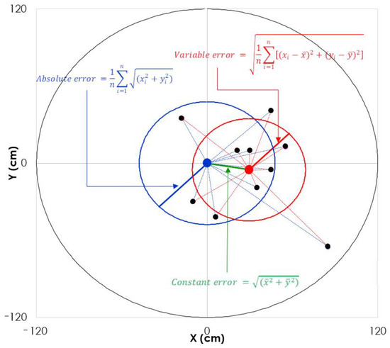 Schematic representation of the ten bullet impact points with the target and the three accuracy errors. The large black circle represents the target (1.2 m radius); The blue point represents the center of the target; The ten black dots represent the points of impact of the ball with the target; Blue dashed lines represent absolute errors; The radius of the blue circle represents the mean absolute error of the 10 shots; The red point represents the barycenter of the 10 black points; Red dashed lines represent relative errors; The radius of the red circle represents the average relative error of the 10 shots; The green line represents the constant error.