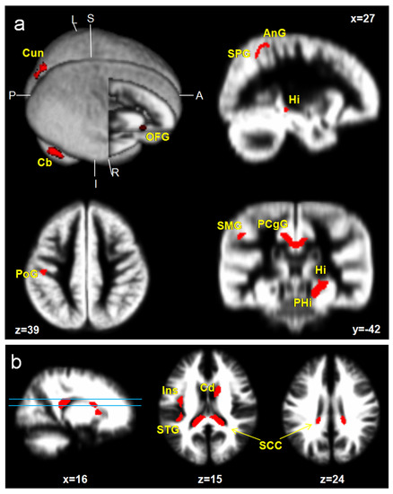 Brain areas with a significant increase in GM (a) and WM (b) volumes in ICPP girls in contrast to age-matched healthy girls (uncorrected; p < 0.001, excluded 100 voxels). Hi, hippocampus; PHG, parahippocampal gyrus; PCgG, posterior cingulate gyrus; Cun, cuneus; PoG, postcentral gyrus; SCC, splenium of corpus callosum; mPFC, medial prefrontal cortex; Ang, angular gyrus; SMG, supramarginal gyrus; SPG, superior parietal gyrus; STG, superior temporal gyrus; Ins, insula; Cd, caudate nucleus; Cb, cerebellar cortex.