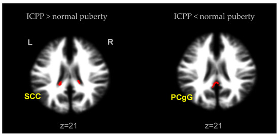 ICPP girls showed no significant difference in GM volumes compared to normal puberty controls, but significantly increased WM volume in SCC. Conversely, a statistically significant increase in the volume of PCgG in WM was observed in the normal puberty group compared to the ICPP group (uncorrected p < 0.001, excluded 100 voxels) (Figure 2, Table 3).