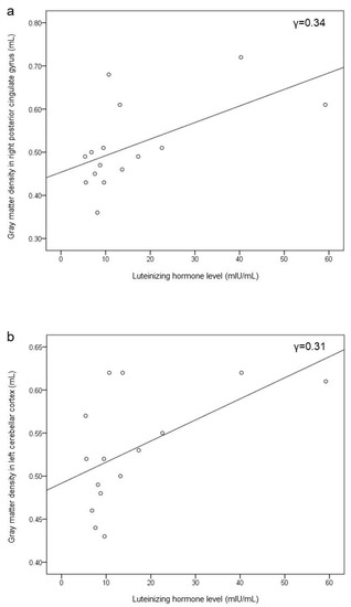 Figure 3 shows the correlation between the GM volumes and LH level in ICPP girls. The volumes of the right PCgG and left Cb were correlated positively with the LH level (r = 0.57, uncorrected p = 0.03 and r = 0.53, uncorrected p = 0.04, respectively).
