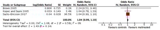 In regard to secondary outcomes, adjusted analyses reported by Raphael and Widom [] did not reveal significant differences in pain interference when participants who had a history of any maltreatment were compared to those who did not (ns). Although Biskin and colleagues [] measured pain interference, the relationship between any maltreatment and interference was not reported.
