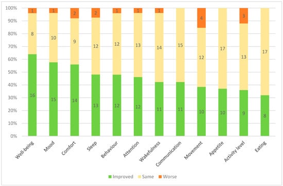 The three domains that improved most (in more than half of the children), which we grouped under the concept of “quality of life”, were wellbeing, mood and comfort. Wellbeing, popularly often coined as “happiness” [], improved for nearly two thirds of the children. Despite its subjective nature, wellbeing is a valid outcome that informed us of how parents thought their child was feeling, by holistically integrating both mental and physical health dimensions. Children and adolescents with disabilities who were able to self-report on their experience, previously highlighted the importance of the happiness and enjoyment provided by taking part in sports []. Likewise, in typically developing children and youth, psychological and social constructs that showed positive associations with sports participation included wellbeing, enjoyment, as well as mental health and perceived health []. Regarding mood, which more specifically reflects the mental component of wellbeing, previous literature demonstrated positive associations with sports in populations with and without disabilities. In typically developing children, several studies demonstrated the protective effect of increased physical activity against depressive and anxiety symptoms throughout school age and adolescence [,,]. In adults with severe neurological impairments the practice of Boccia demonstrated positive influences on psychological health and mood [] while young people with disabilities who practised sports reported improvements in confidence and self-esteem []. Children with PIMD have numerous reasons to experience discomfort and pain, and in our study adaptive sports seemed to be able to provide relief and improved comfort (reflecting the physical component of wellbeing) for a majority of children. Sedentary behaviour and low participation in physical activity were reported as risk factors for chronic pain, especially musculoskeletal pain, in typically developing children and adolescents [,,], highlighting the value of moderate-to-vigorous physical activity in preventing these symptoms. Beyond their sedentary behaviour, certain children with PIMD present high degrees of physical disuse, which is strongly associated with acute and chronic pain via mechanical hyperalgesia, with peripheral and central sensitization []. Even more than in typically developing children, regular movement and physical activity such as those provided by adaptive sports may play an important role in supporting comfort and preventing pain.