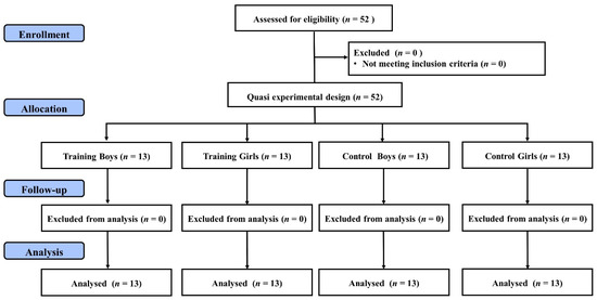 Fifty-two healthy children from a public elementary school voluntarily participated in this study (Sanchong district, New Taipei City, Taiwan). Based on a quasi-experimental design, thirteen children of the same gender were assigned into the FIFA 11+ for Kids Boys (training boys) group, the FIFA 11+ for Kids girls (training girls) group, control boys group, or control girls group (see Figure 1).