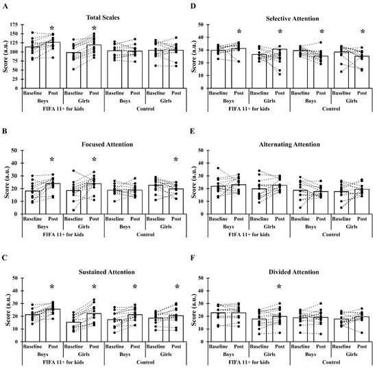 Pooled and individual subscales of the Attention Scale for Elementary School Children test before and after the interventional period in the FIFA 11+ for Kids boys, FIFA 11+ for Kids girls, control boys, and control girls; (A) total scale, (B) focused attention, (C) sustained attention, (D) selective attention, (E) alternating attention, and (F) divided attention. * indicates significant difference in the Wilcoxon test.