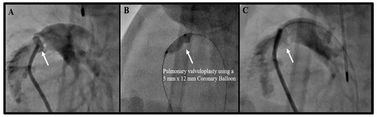 Angiograms of a Pulmonary Valvuloplasty in a 900-gram Infant. (A) Angiogram showing a dysplastic, thickened pulmonary valve. (B) Balloon angioplasty of the pulmonary valve with an obvious “waist.” (C) Post-balloon angioplasty angiogram of the pulmonary valve.