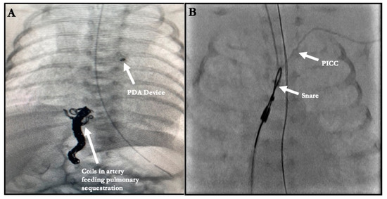 (A) Patient in whom the afferent artery to the sequestrated right lower lobe was coil embolized through the PDA with eventual device closure of the PDA. (B) Foreign Body Retrieval. Retrieval of a retained peripherally inserted central catheter tip.