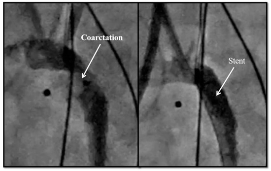 All the listed procedures were performed via a femoral venous access-only approach including the two ductal stenting cases, except for the coarctation stents (Figure 3), which were performed via the carotid artery approach. This was accomplished via a surgical cutdown in all except for one, in whom the carotid artery was accessed percutaneously. Of the six coarctation stents, two acquired secondary coarctations to TCPC, where the device caused the stenosis. In both these cases, retrieval attempts were not made, and we proceeded straight to stent implantation. One patient eventually died of pneumonia. The other patient required stent re-dilation at one year of age. All coarctation stents were pre-mounted coronary artery stents. The first four patients had drug-eluting stents, with two patients developing blood stream infections at a later date. It was unclear whether the infection was secondary to the immunosuppression from the drug. Therefore, for the last two patients in this series that required coarctation stenting, bare-metal stents were used instead. Overall, three patients did not survive past a few months, while all three survivors had stent re-dilation at least once, with the eventual goal of stent unzipping [23,24] in the future.