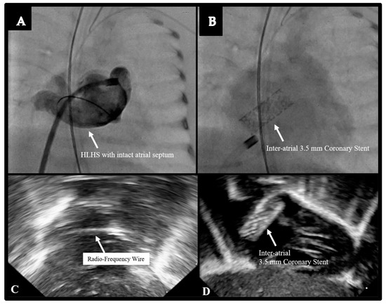 Inter-atrial stent placement in an 890 g infant with Hypoplastic Left Heart Syndrome with an Intact Atrial Septum. (A) Angiogram of the intact atrial septum. (B) Placement of a coronary stent across the atrial septum. (C) Echocardiographic image of the radio-frequency wire across the atrial septum. (D) Echocardiographic image of the coronary stent.