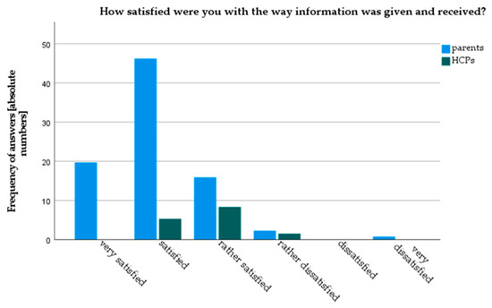 Both parents and HCPs gave good overall ratings to current counselling practice in our clinic. However, parents rated current counseling practice significantly better than HCPs (3.9 vs. 3.5 (p = 0.04) on a Likert scale from 1: very bad to 5: very good) (Figure 2). Parents were also more satisfied with current counseling practice (4.96 vs. 4.25, p < 0.01, on a 6-point Likert-scale). Only 3.6% of parents stated they were “very dissatisfied” or “rather dissatisfied” with current counseling, whereas 10% of HCPs rated themselves as “rather dissatisfied” (Figure 3). Results from the focused interviews reflected these findings: all parents declared themselves satisfied or very satisfied, while HCPs found the status quo predominantly “mediocre” or “with room for improvement”.