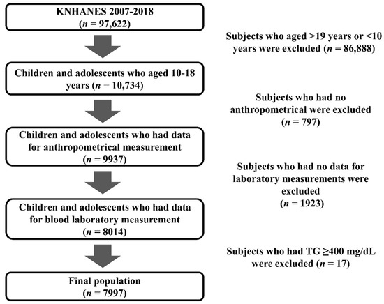 KNHANES enrolled 97,622 individuals between 2007 and 2017. Of these, our preliminary analyses included 10,734 (5670 boys, 5064 girls) aged 10–18 years (Figure 1). We attempted to include a large number of representative Korean children and adolescents. After obtaining informed consent, the participants and their parents were interviewed at their homes, and the participants underwent several examinations, including blood sampling, an oral examination, and pulmonary function tests. Different blood tests were conducted in each survey. The levels of glucose, HbA1c, total cholesterol, triglyceride, HDL cholesterol, LDL cholesterol (measured directly), HBs Ag, AST, ALT, HCV titer, BUN, and creatinine were measured annually. In the seventh survey from 2017 to 2018, the levels of hsCRP, uric acid, folate, vitamin A, and vitamin E were measured. In addition, the levels of urinary pH, nitrite, specific gravity, protein, glucose, ketone, cotinine, sodium, potassium, and heavy metals (including cadmium and mercury) were evaluated every year. The hematological parameters recorded were the WBC, RBC, Hb, Hct, and platelet count. Participants with incomplete physical examination records, including incomplete anthropometric measurements and laboratory test results (such as lipid profiles) or triglyceride levels ≥400 mg/dL, were excluded (n = 17). The KNHANES database is publicly available (http://knhabes.cdc.go.kr, accessed on 4 August 2021). The 2007–2018 KNHANES study protocols were approved by the Institutional Review Board of the Korean Centers for Disease Control and Prevention. Informed consent was provided by the KNHANES participants.
