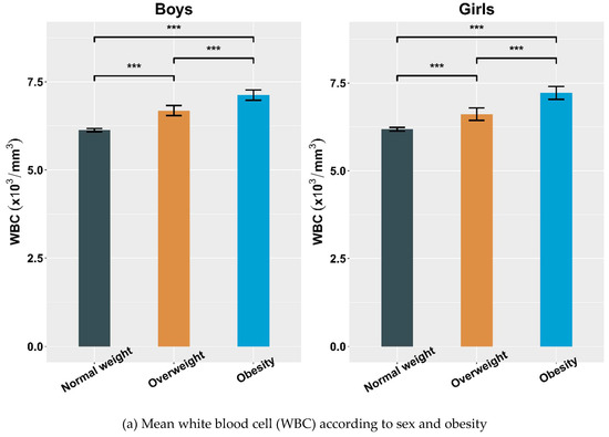 The adjusted mean levels of hematological parameters were significantly different among the BMI groups (Table 3). OB participants had higher adjusted mean levels of WBCs (7.16 vs. 6.16 × 103/mm3), RBCs (4.90 vs. 4.82 × 106/mm3), Hct (42.31% vs. 41.91%), and platelets (311.87 vs. 282.66 × 103/mm3) (p < 0.001 for all) compared with NW participants. Similarly, OB girls had higher adjusted mean levels of WBCs, RBCs, Hct, and platelets (p < 0.001 for all) compared with NW girls. Although the Hb level was significantly different among the three groups, the post-hoc tests did not reveal a significant difference in all participants and girls. OB boys had higher adjusted mean levels of WBCs, RBCs, Hb, Hct, and platelets than those of NW boys (p < 0.001 for all).