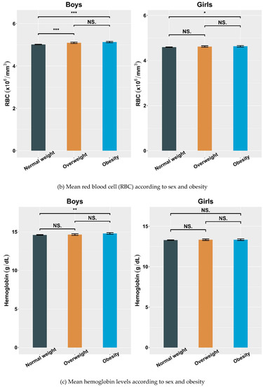 The mean hematological parameters according to sex and BMI are shown in Figure 2. The mean WBC count was significantly elevated in boys and girls in all groups (Table 2). In both sexes, the OB group showed significantly higher mean RBC and Hct levels compared with the NW group. The mean Hb level was significantly higher in the OB than NW group in boys but not girls. Mean platelet counts in the OW and OB groups were significantly higher than that in the NW group for both sexes.