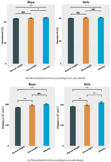 Mean white blood cell (WBC), red blood cell (RBC), hemoglobin, hematocrit, and platelet levels according to sex and obesity. (a), Mean white blood cell (WBC) according to sex and obesity; (b), Mean red blood cell (RBC) according to sex and obesity; (c), Mean hemoglobin levels according to sex and obesity; (d), Mean hematocrit levels according to sex and obesity; (e), Mean platelet levels according to sex and obesity; *, p < 0.05; **, p < 0.005; ***, p < 0.001; NS., p > 0.05.