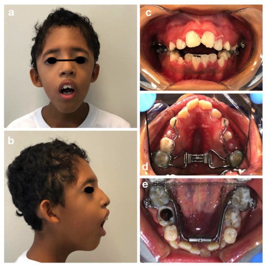 The intraoral examination showed a mixed dentition with lacking space in both arches for the eruption of the permanent incisors and a class III malocclusion with anterior crossbite (Figure 4c), due to maxillary hypoplasia.
