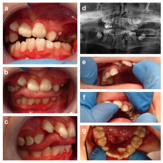 The Cornelia de Lange syndrome: intra-oral pictures (a–c,e–g) and orthopantomography (d).