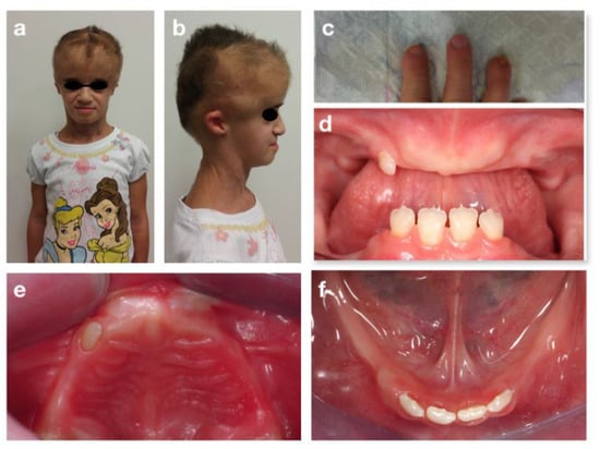 - Alliot-Licht, B.; Lusson, C.; Hyon, I.; Dajean-Trutaud, S.; Le Caignec, C.; Lopez-Cazaux, S. Signes extra-oraux à rechercher face à des signes bucco-dentaires d’alerte de maladies d’origine génétique [Extra-oral signs to look for in patients exhibiting oral warning signs of genetic diseases]. Comptes Rendus Biol. 2015, 338, 48–57. [Google Scholar] [CrossRef] [PubMed]