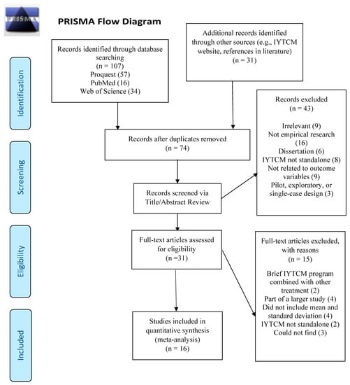 Before applying inclusion criteria, the first author and an undergraduate student screened the titles and abstracts to remove irrelevent articles and duplicates, which resulted in 31 studies. To be eligible for this meta-analysis, the studies had to meet the following criteria (a) examined IYTCM as an intervention or prevention program for TCM training and/or for children with or without externalizing behaviors; (b) examined IYTCM as a standalone program; (c) included an RCT with a control group, (i.e., treatment as usual, placebo, waitlist, no treatment), quasi-experimental design, or pre-post design; (d) published in peer-reviewed journals or conference abstracts in English; (e) included essential information to calculate effect size (i.e., included pre and post means, standard deviation, and raw data in order to calculate and standardize effect sizes); (f) measured outcomes that fell into one of the categories of prosocial behavior, externalizing behavior, positive use of teacher strategies, negative use of teacher strategies, and teacher perceived usefulness of positive strategies. Excluded studies included dissertations, pilot studies, single-case designs, brief IYTCM programs (i.e., 4 sessions or less), combined with another intervention, self-administered IYTCM programs, or part of a larger study such as [41] which included the same sample of students in a follow-up report. Additionally, conference abstracts were identified, but those later found in peer-reviewed journals were excluded to avoid redundancy. Application of the inclusion criteria to the initial search resulted in 15 studies. Finally, the first author searched the references of the 15 studies identified and found 1 additional article that met the above criteria [23]. This resulted in a total of 16 articles (Figure 1).