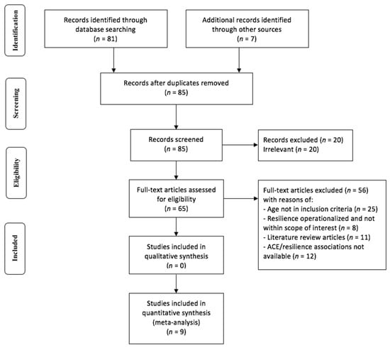 Details of the selection process are specified in the PRISMA diagram (Figure 1) below. A total of 85 non-duplicate records were identified from the database searches. After screening, 20 articles were excluded due to irrelevance. Among the remaining 65 articles, 56 were further excluded because they were literature review articles, had insufficient statistical information (non-disclosure of the ACE-resilience association), and/or had variables (i.e., age, operationalized definition of resilience) that were not within the scope of the inclusion criteria. Characteristics of the nine remaining articles that qualified for the meta-analysis are specified in Table 1 below.