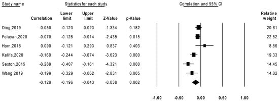 A total of nine studies (161,165 participants) were in included in this systematic review. Among them, six independent studies (n = 2933) were used to conduct a correlational meta-analysis to examine the relationship between ACEs and psychological resilience. The pooled correlation coefficient was −0.120 (95% CI [−0.196, −0.043], p < 0.001) (Figure 2). The funnel plot was symmetrical (Figure S1), and the heterogeneity test revealed an I2 = 72.4% and a Tau2 = 0.006. The Eggers’ regression test determining the pooled correlation effects yielded an intercept = −1.458 (95% CI [−7.274, 4.358], p = 0.52), indicating a low likelihood of publication bias.