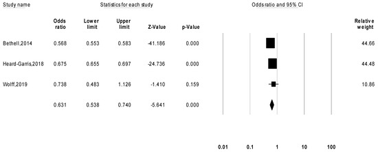 The meta-analysis of the studies reporting dichotomous outcomes confirmed that the subjects were 63% less likely to manifest psychological resilience against ACEs. Among the three meta-analyzed studies, two studies obtained data from the National Survey of Children’s Health, which likely explains the similar resilience outcomes [4,20]. A greater discrepancy was observed in Wolff’s (2019) study, which investigated the relationships between ACEs, resilience, and mental and behavioral health conditions in pregnant women [19]. Largely because of age discrepancy in the observed subjects and study contexts, there was no significant difference found between pregnant women with low and high resilience on the mean number of ACEs. In addition, all papers that examined the role of family and community presence as external protective components further confirmed a significant association between these factors and increased psychological resilience. Significant covariates included family support, attending religious activities, eating and sharing ideas with one’s family, safe, clean neighborhoods with communal amenities, and mentorship from community members [4,6,20,23].