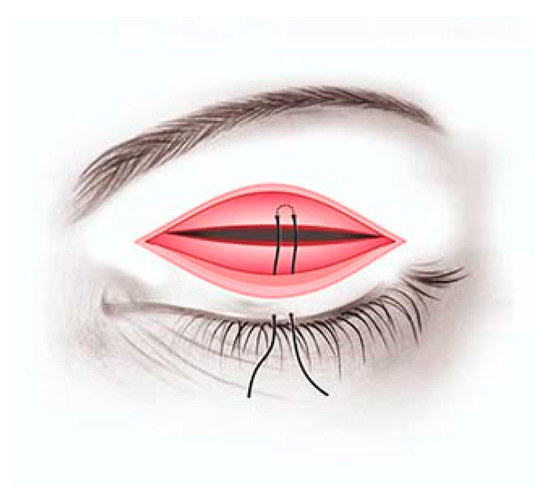 Schematic representation of the suture trajectory: skin (ciliary margin)—upper tarsal plate—skin (ciliary margin) (picture by Speranța Schmitzer).
